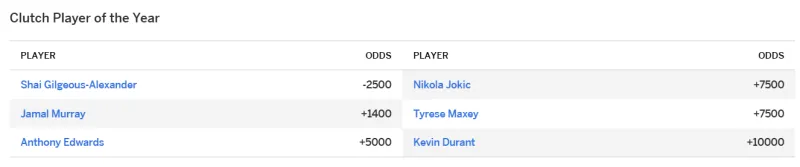 虎扑04月09日讯 今日ESPN官方更新了本赛季的年度关键球员赔率榜单,雷霆球员谢伊-吉尔杰斯-亚历山大以-2500位居榜首,掘金球员贾马尔-默里以+1400位居次席。